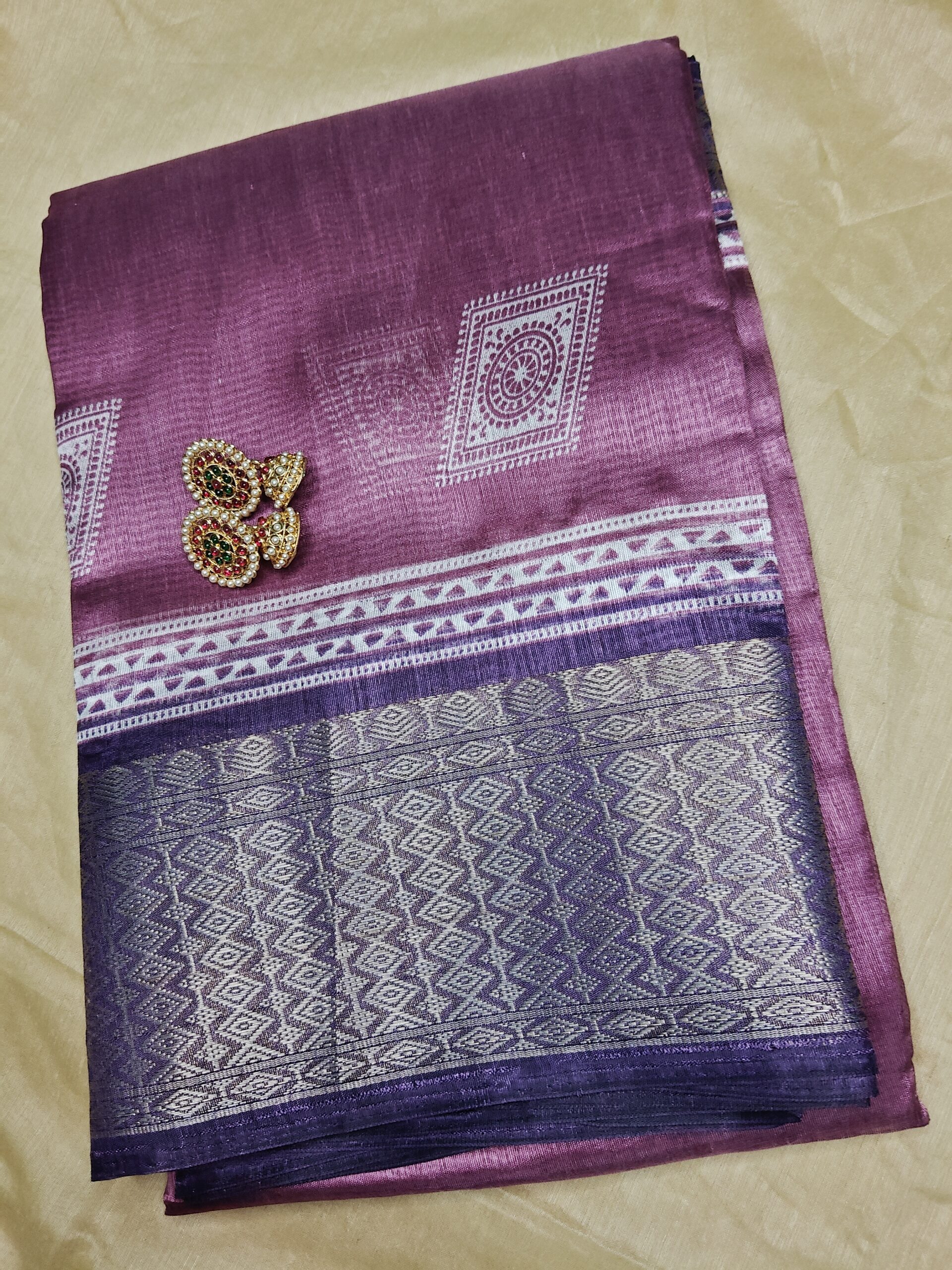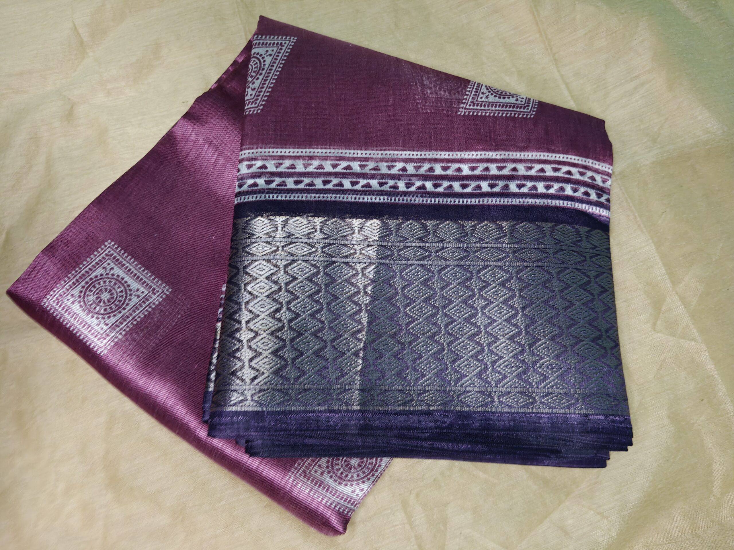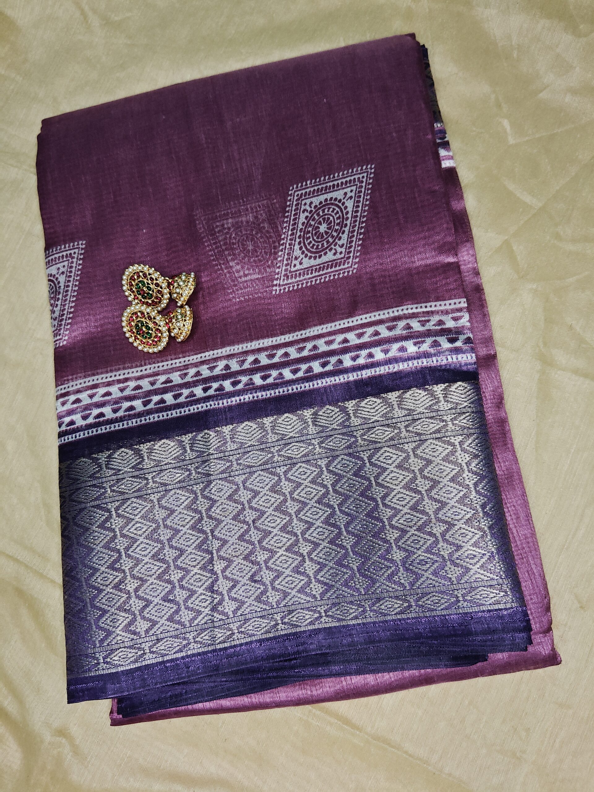 The Plum Elegance Silk Blend Saree showcases a rich plum-purple body paired with a beautifully woven contrast border in deeper violet tones. The saree features subtle traditional geometric motifs on the body and a finely detailed zari-style woven border that adds a graceful, festive touch without being overpowering.
